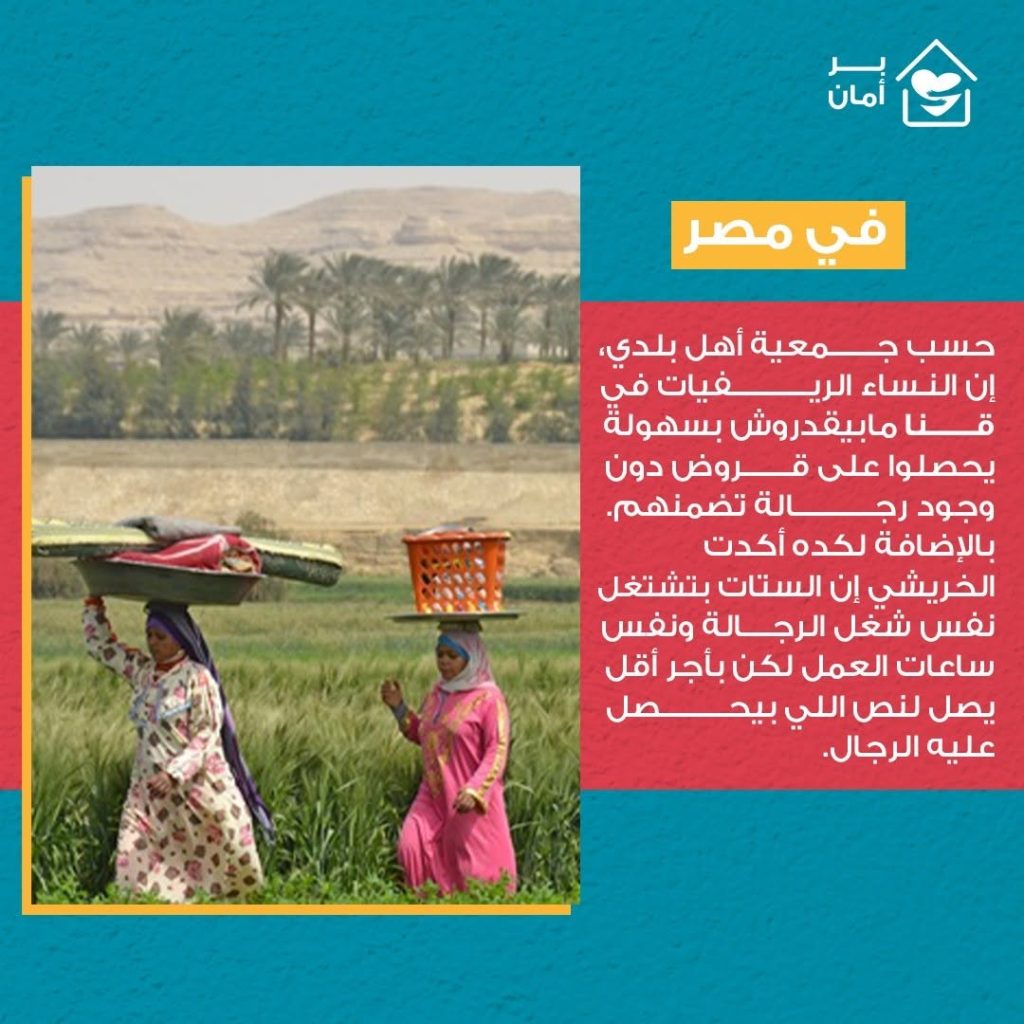 صرحت صفاء خريشي، رئيسة مجلس إدارة جمعية أهل بلدي، إن النساء الريفيات في قنا مابيقدروش بسهولة يحصلوا على قروض دون وجود رجالة تضمنهم. بالإضافة لكده أكدت الخريشي إن الستات بتشتغل نفس شغل الرجالة ونفس ساعات العمل لكن بأجر أقل يصل لنص اللي بيحصل عليه الرجال.
