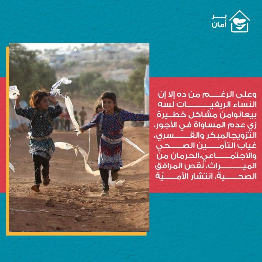 وعلى الرغم من ده إلا إن النساء الريفيات لسه بيعانوا من مشاكل خطيرة زي عدم المساواة في الأجور، التزويج المبكر والقسري، غياب التأمين الصحي والاجتماعي، الحرمان من الميراث، نقص المرافق الصحية، انتشار الأميّة….