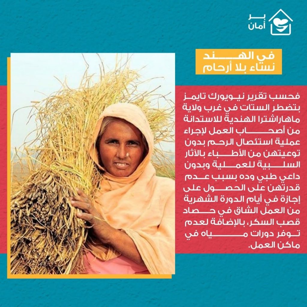 فحسب تقرير نيويورك تايمز بتضطر الستات في غرب ولاية ماهاراشترا الهندية للاستدانة من أصحاب العمل لإجراء عملية استئصال الرحم بدون توعيتهن من الأطباء بالآثار السلبية للعملية وبدون داعي طبي وده بسبب عدم قدرتهن على الحصول على إجازة في أيام الدورة الشهرية من العمل الشاق في حصاد قصب السكر، بالإضافة لعدم توفر دورات مياه في أماكن العمل.