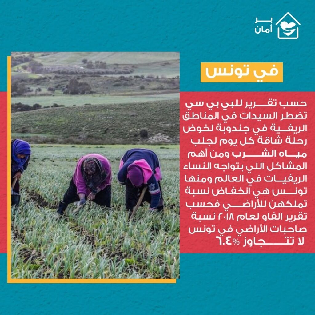 حسب تقرير للبي بي سي تضطر السيدات في المناطق الريفية في جندوبة لخوض رحلة شاقة كل يوم لجلب مياه الشرب اللي يعتبر مسؤولية المرأة. ومن أهم المشاكل اللي بتواجه النساء الريفيات في العالم ومنها تونس هي انخفاض نسبة تملكهن للأراضي فحسب تقرير الفاو لعام 2018 نسبة صاحبات الأراضي في تونس لا تتجاوز 6.4% .