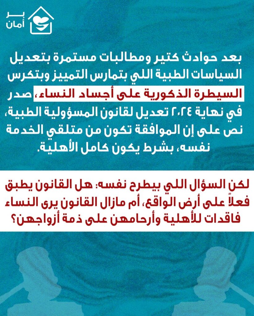 بعد حوادث كتير ومطالبات مستمرة بتعديل السياسات الطبية اللي بتمارس التمييز وبتكرس السيطرة الذكورية على أجساد النساء، صدر في نهاية 2024 تعديل لقانون المسؤولية الطبية، نص على إن الموافقة تكون من متلقي الخدمة نفسه، بشرط يكون كامل الأهلية.