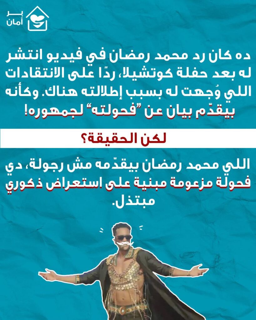 ده كان رد محمد رمضان في فيديو انتشر له بعد حفلة كوتشيلا، ردًا على الانتقادات اللي وُجهت له بسبب إطلالته هناك. وكأنه بيقدّم بيان عن “فحولته” لجمهوره!