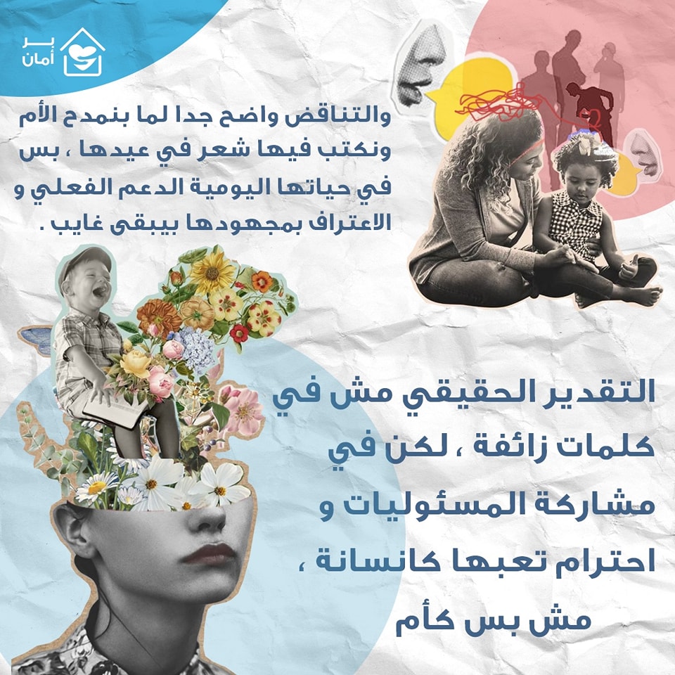 والتناقض واضح جدًا لما بنمدح الأم ونكتب فيها شعر في عيدها، بس في حياتها اليومية الدعم الفعلي والاعتراف الحقيقي بمجهودها بيبقى غايب.
