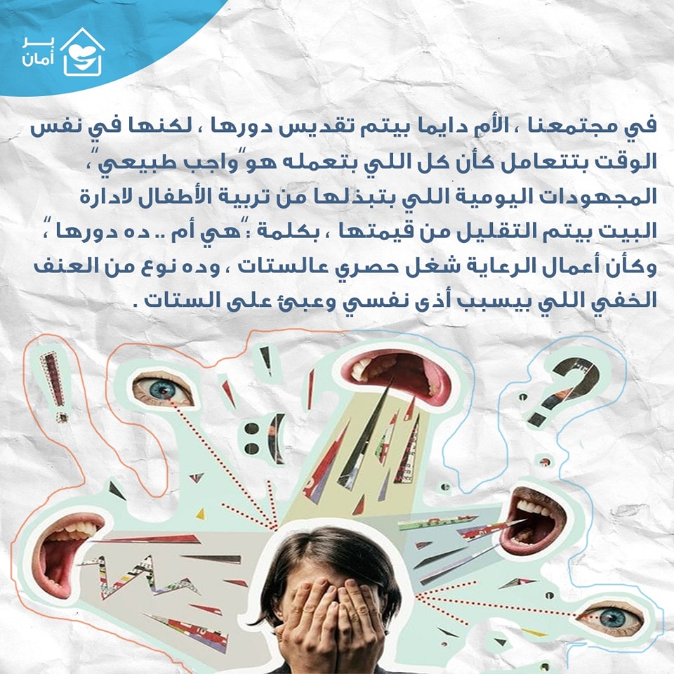 في مجتمعنا، الأم دايمًا بيتم تقديس دورها، لكنها في نفس الوقت بتتعامل كأن كل اللي بتعمله “واجب طبيعي” المجهودات اليومية اللي بتبذلها من تربية الأطفال لإدارة البيت بيتم التقليل من قيمتها بكلمة “هي أم، ده دورها”، وكأن أعمال الرعاية شغل حصري عالستات.