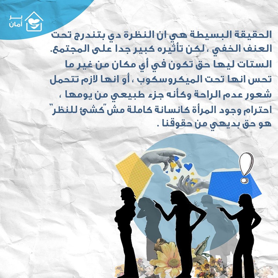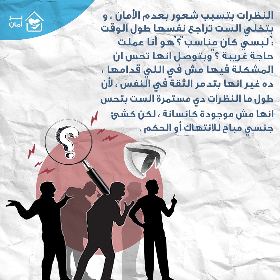 النظرات دي بتسبب شعور بعدم الأمان وبتخلي الست تراجع نفسها طول الوقت: “لبسي كان مناسب؟”، “هو أنا عملت حاجة غريبة؟”، وبتوصل إنها تحس إن المشكلة فيها مش في اللي قدامها. ده غير إنها بتدمر الثقة في النفس، لأن طول ما النظرات دي مستمرة الست بتحس إنها مش موجودة كإنسانة، لكن كشيء جنسي مباح للانتهاك أو للحكم.