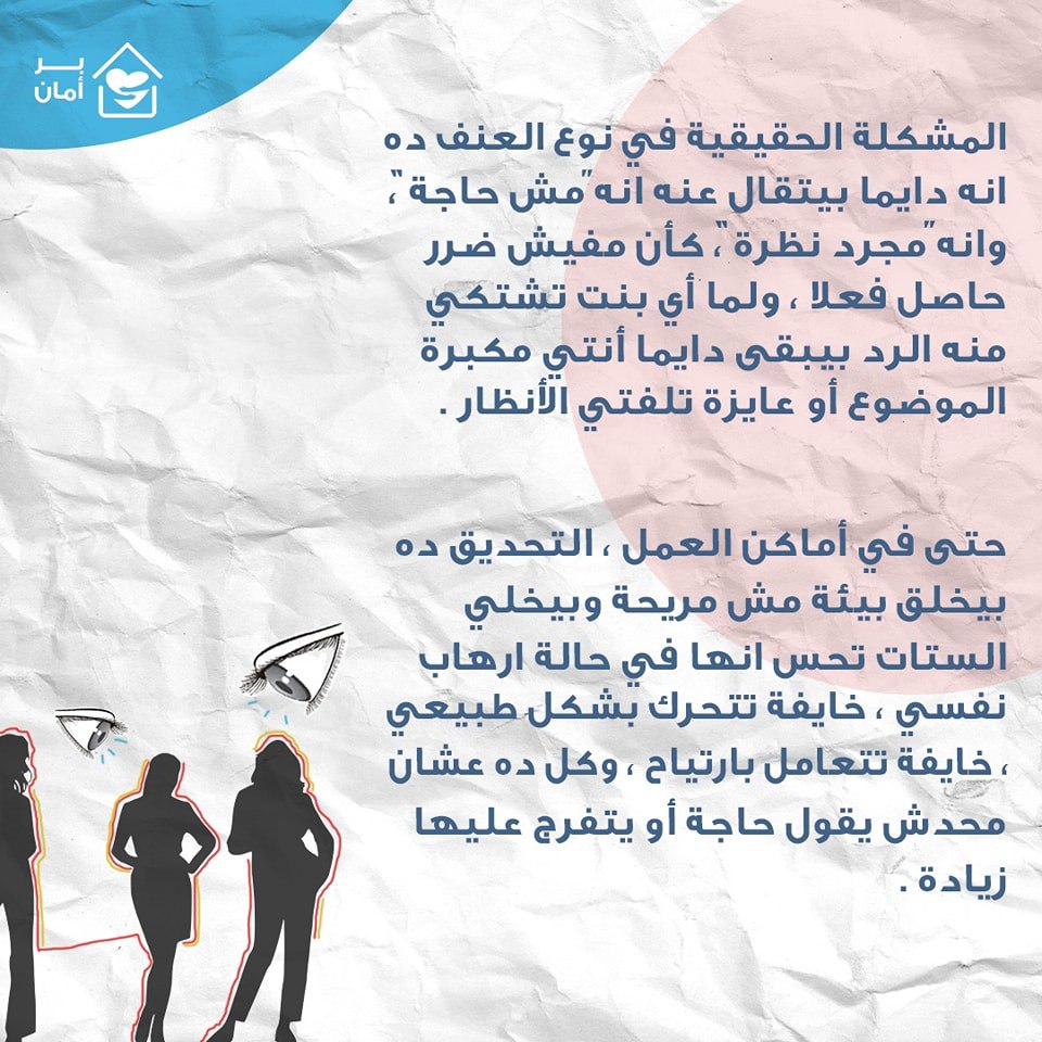 المشكلة الحقيقية في النوع ده من العنف إنه دايمًا بيتقال عنه إنه “مش حاجة”، وإنه “مجرد نظرة”، كأن مفيش ضرر حاصل فعلا. ولما أي بنت تشتكي منه، الرد بيبقى دايمًا “إنتي مكبرة الموضوع” أو “عايزة تلفتي الأنظار”.